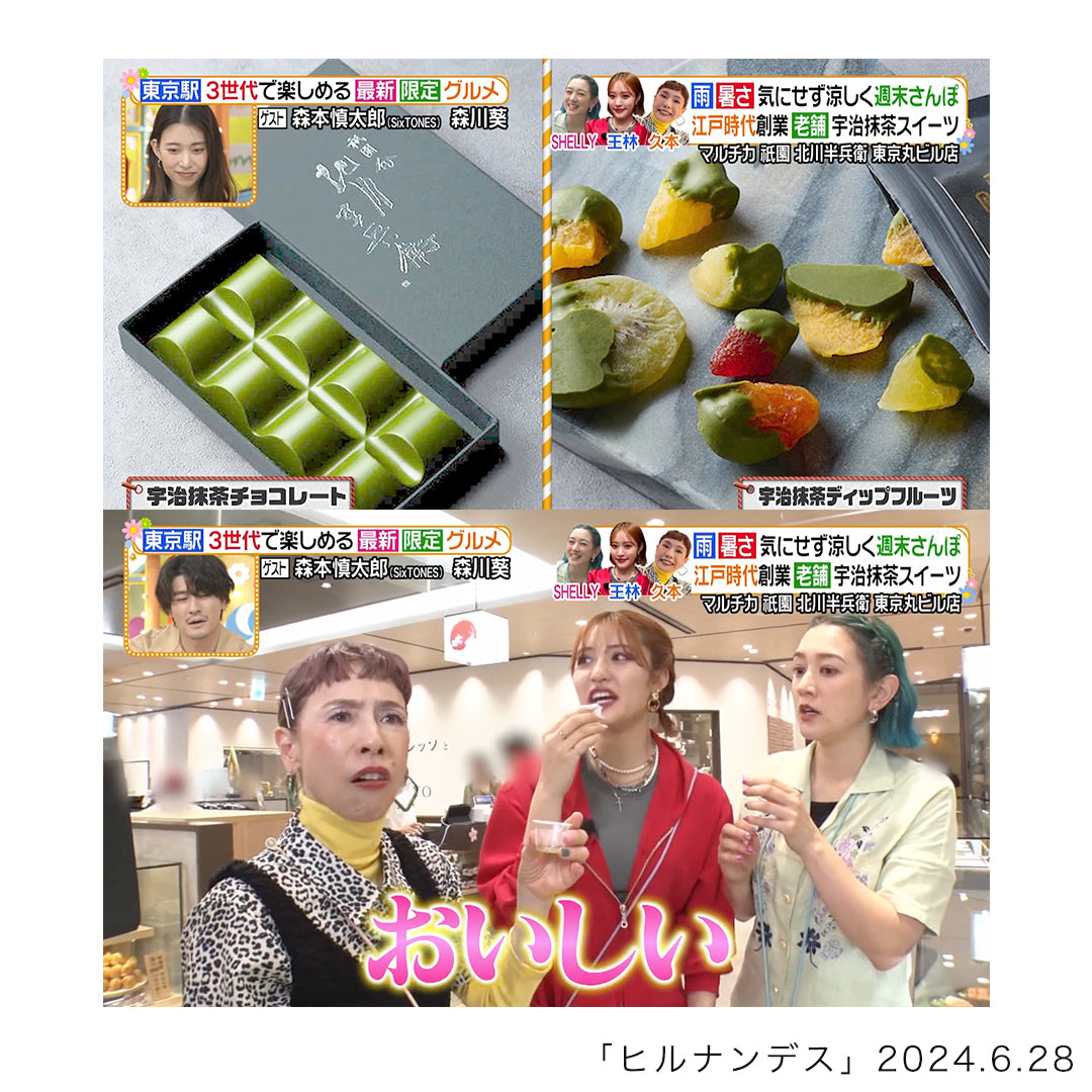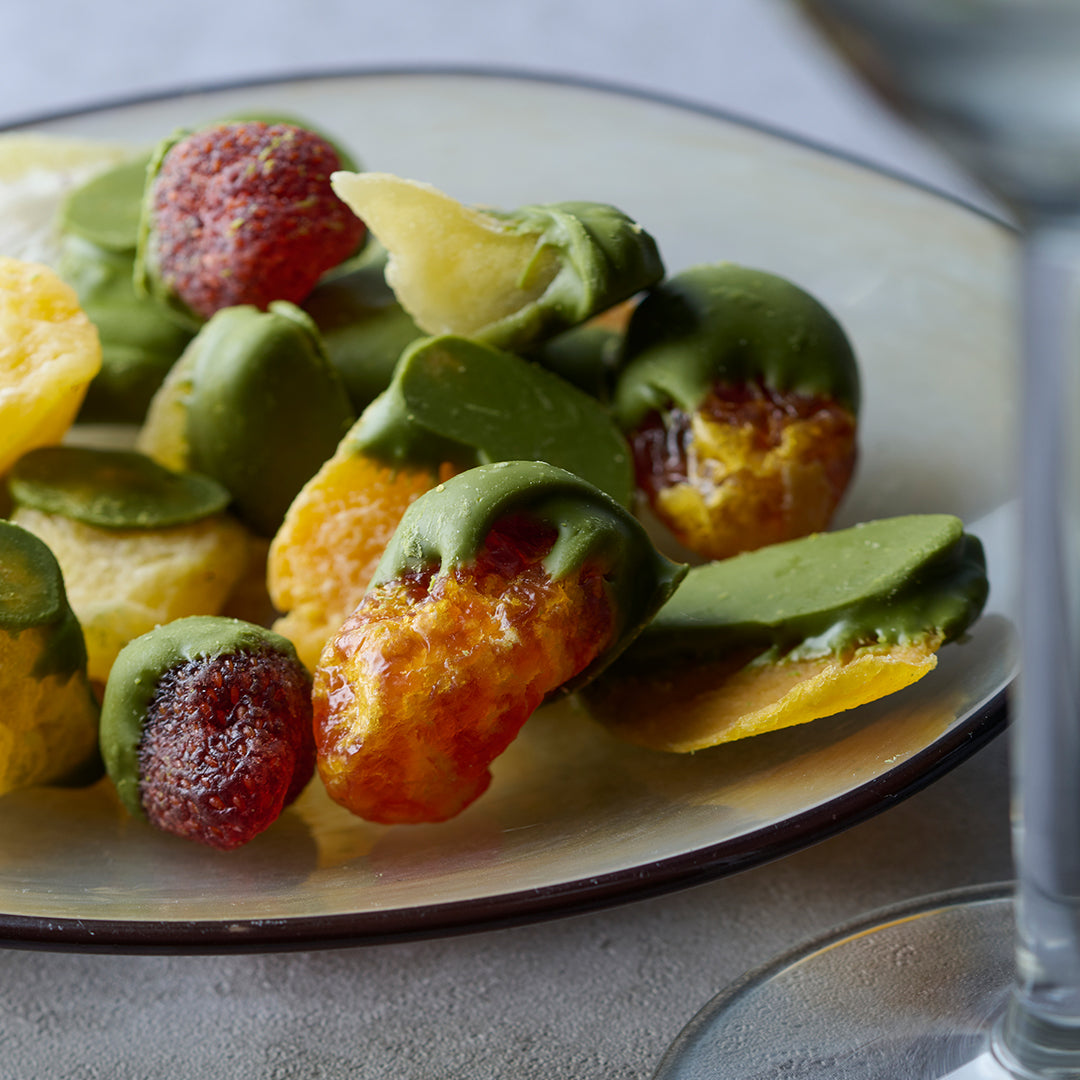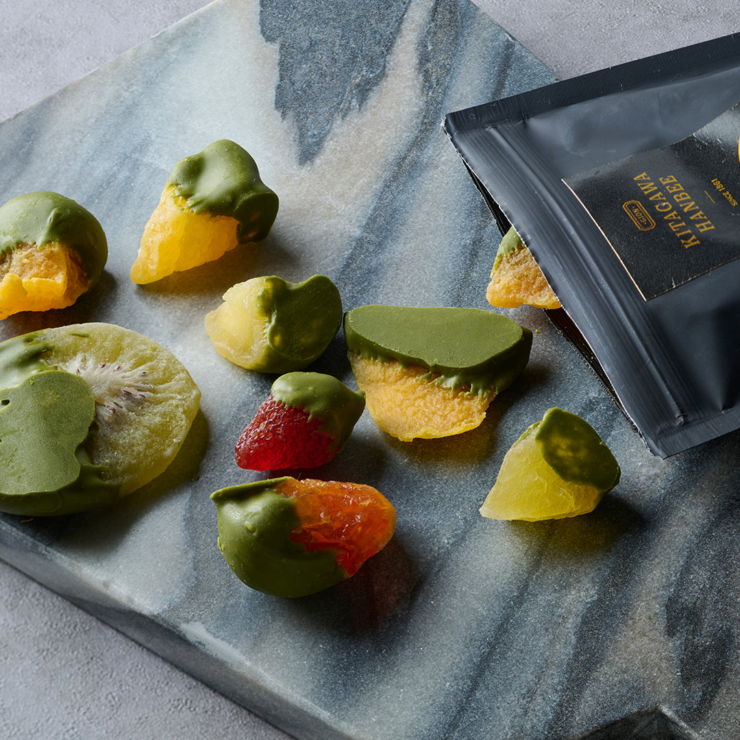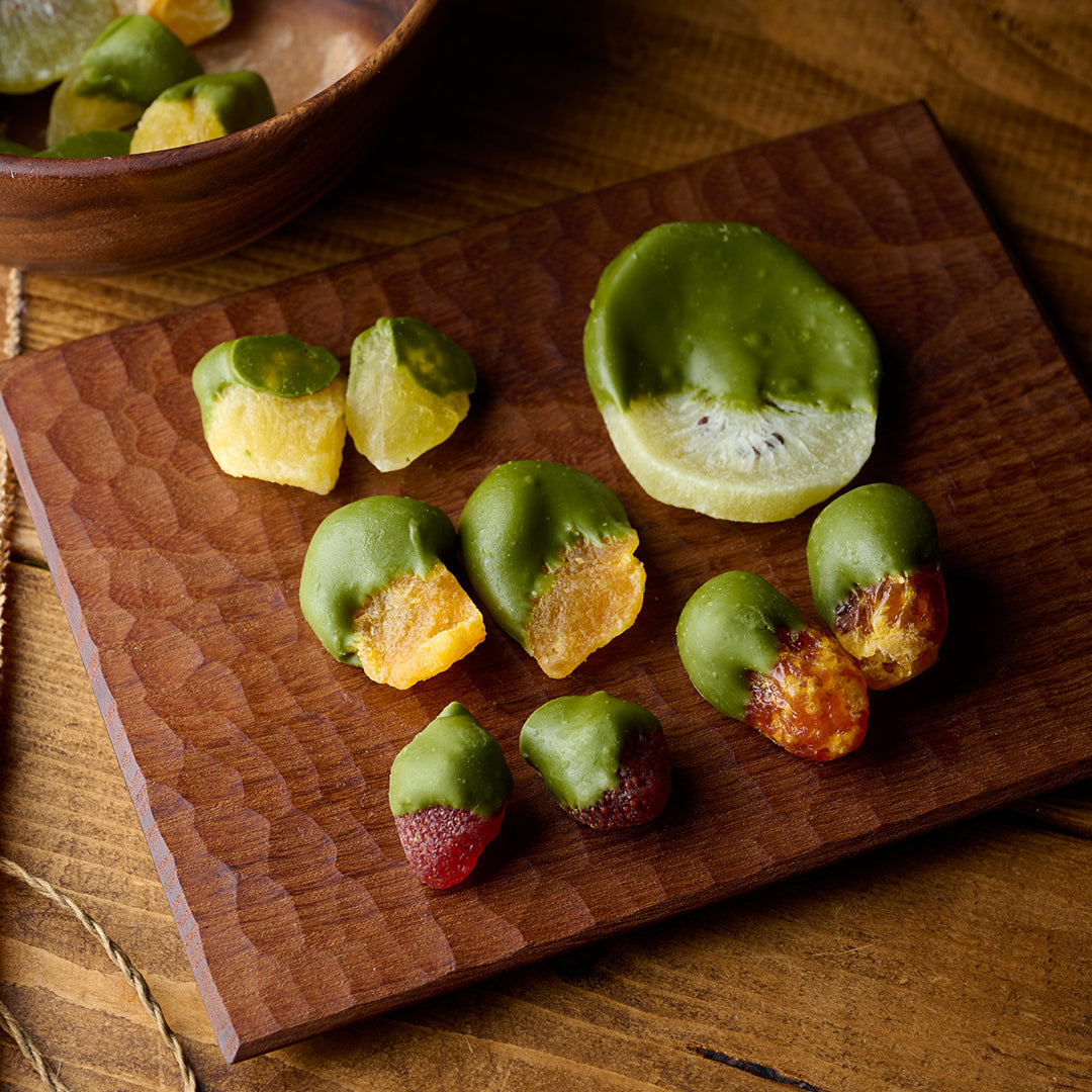 祇園 北川半兵衛の宇治抹茶がたっぷりディップされたフルーツ。
